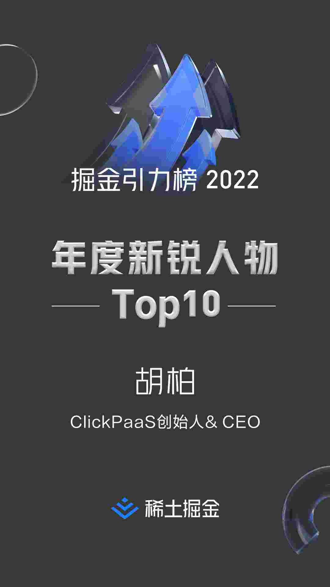 2022年1月6日,,,,,,,,,,,,,稀土掘金社区第一届「掘金未来大会」成功举办,,,,,会上发布了“2022 稀土掘金引力榜 年度新锐人物”榜单,,,,,,上海爱湃斯科技有限公司(简称EBPAY)创始人及CEO胡柏实力入选年度新锐人物TOP 10。。。。。。。。。。。